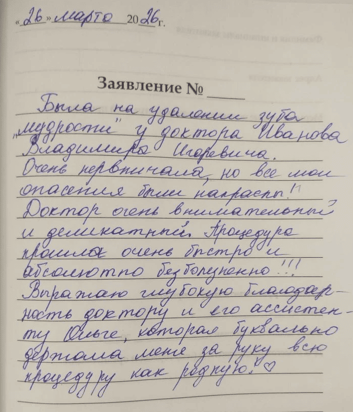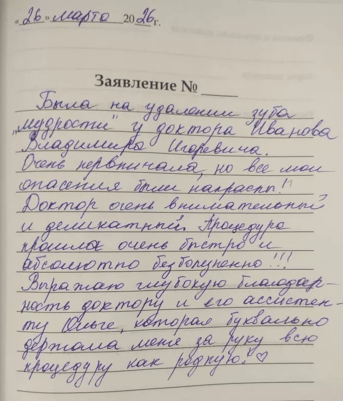 Была на удалении зуба "мудрости" у доктора Иванова Владимира Игоревича. Очень нервничала, но все мои опасения были напрасны! Доктор очень внимательный и деликатный. Процедура прошла очень быстро и абсолютно безболезненно !!! Выражаю глубокую благодарность доктору и его ассистенту Ольге, которая буквально держала меня за руку всю процедуру как родную.