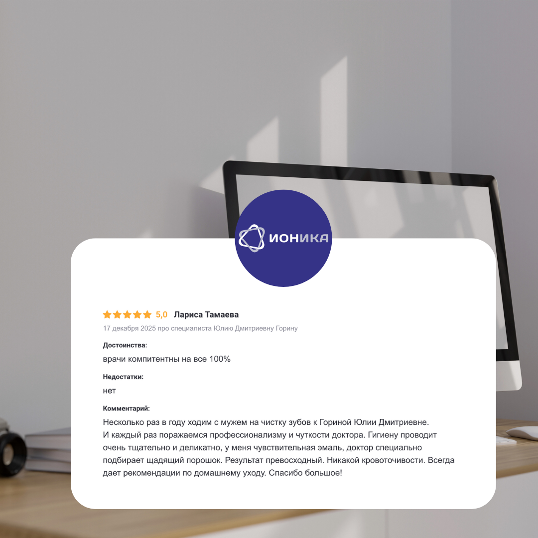 Доктор Горина Юлия Дмитриевна ну очень Крутая! сделали мне проф чистку просто идеально, я очень довольна врачом, и клиникой Ионика все на высшем уровне! спасибо