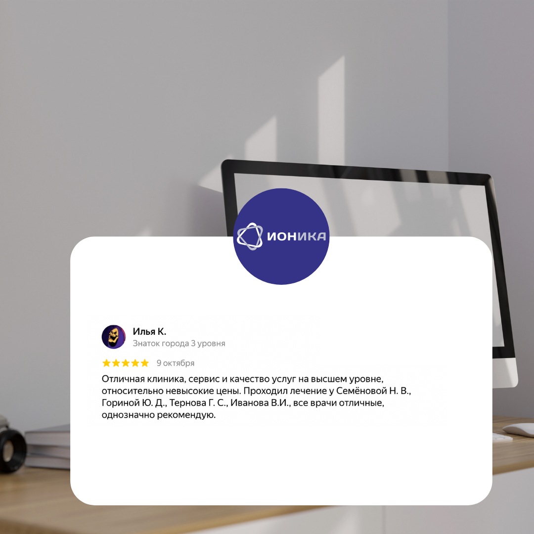 Я сложный пациент, за 50 лет накопилось. С "Ионикой" и её прекрасными врачами прошла длинный путь к здоровью и красивой улыбке... Терапевтическое лечение, протезирование, теперь гигиена. Особая благодарность Сипкину Александру Михайловичу (челюстно-лицевой хирург) - профессионал! В Ионике про любого врача можно так сказать. Лечение по протоколу и скидки, что безусловно приятно. С большим доверием и благодарностью ко всему коллективу клиники.
