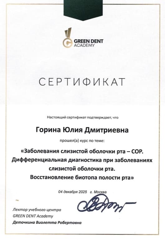 Несколько раз в году ходим с мужем на чистку зубов к Гориной Юлии Дмитриевне. И каждый раз поражаемся профессионализму и чуткости доктора. Гигиену проводит очень тщательно и деликатно, у меня чувствительная эмаль, доктор специально подбирает щадящий порошок. Результат превосходный. Никакой кровоточивости. Всегда дает рекомендации по домашнему уходу. Спасибо большое!