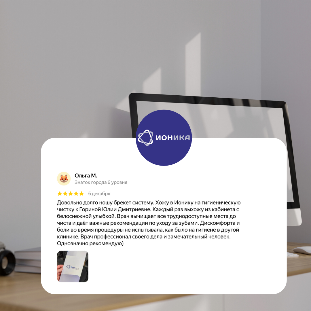 Довольно долго ношу брекет систему. Хожу в Ионику на гигиеническую чистку к Гориной Юлии Дмитриевне. Каждый раз выхожу из кабинета с белоснежной улыбкой. Врач вычищает все труднодоступные места до чиста и даёт важные рекомендации по уходу за зубами. Дискомфорта и боли во время процедуры не испытывала, как было на гигиене в другой клинике. Врач профессионал своего дела и замечательный человек. Однозначно рекомендую)