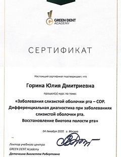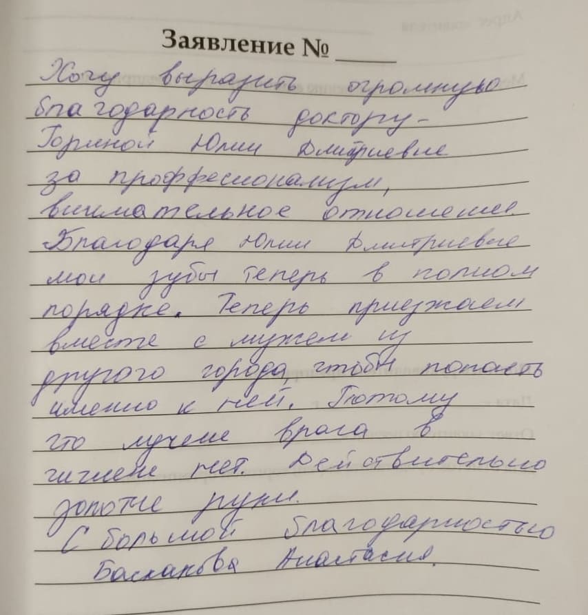 Выражаю свою благодарность Гориной Юлии Дмитриевне. Хочу отметить высокий профессионализм и чуткое отношение к пациентам. Спасибо за качественную работу и отличный результат.