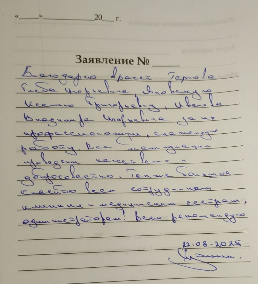 Хочу отметить врача Иванова Владимира Игоревича. Мне понравился его профессионализм в подходе к лечению, забота о пациенте, доброжелательность. Медперсоналу и администраторам особое спасибо!