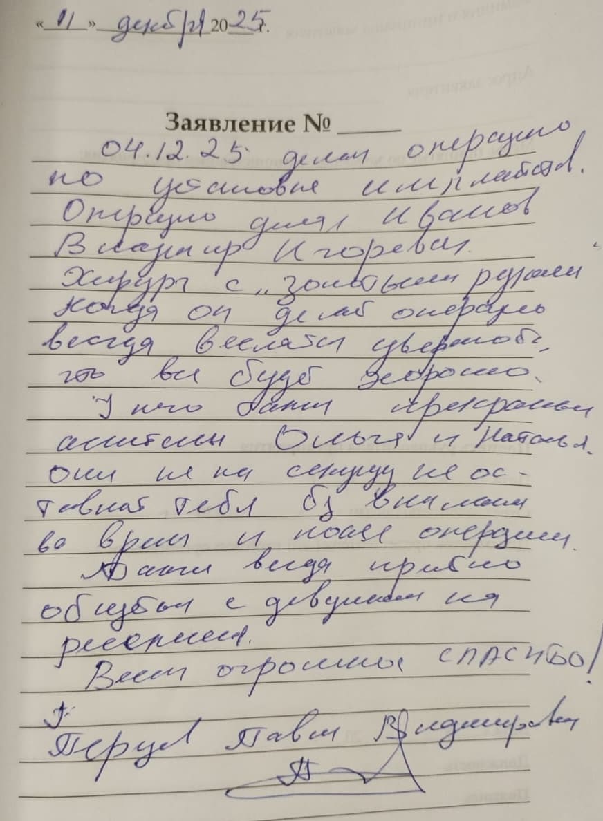 Очень благодарен хирургу Иванову Владимиру Игоревичу за его «золотые руки» и благородное сердце. Большой профессионал и очень отзывчивый человек. Вся семья ездит к нему за помощью за 100 км.