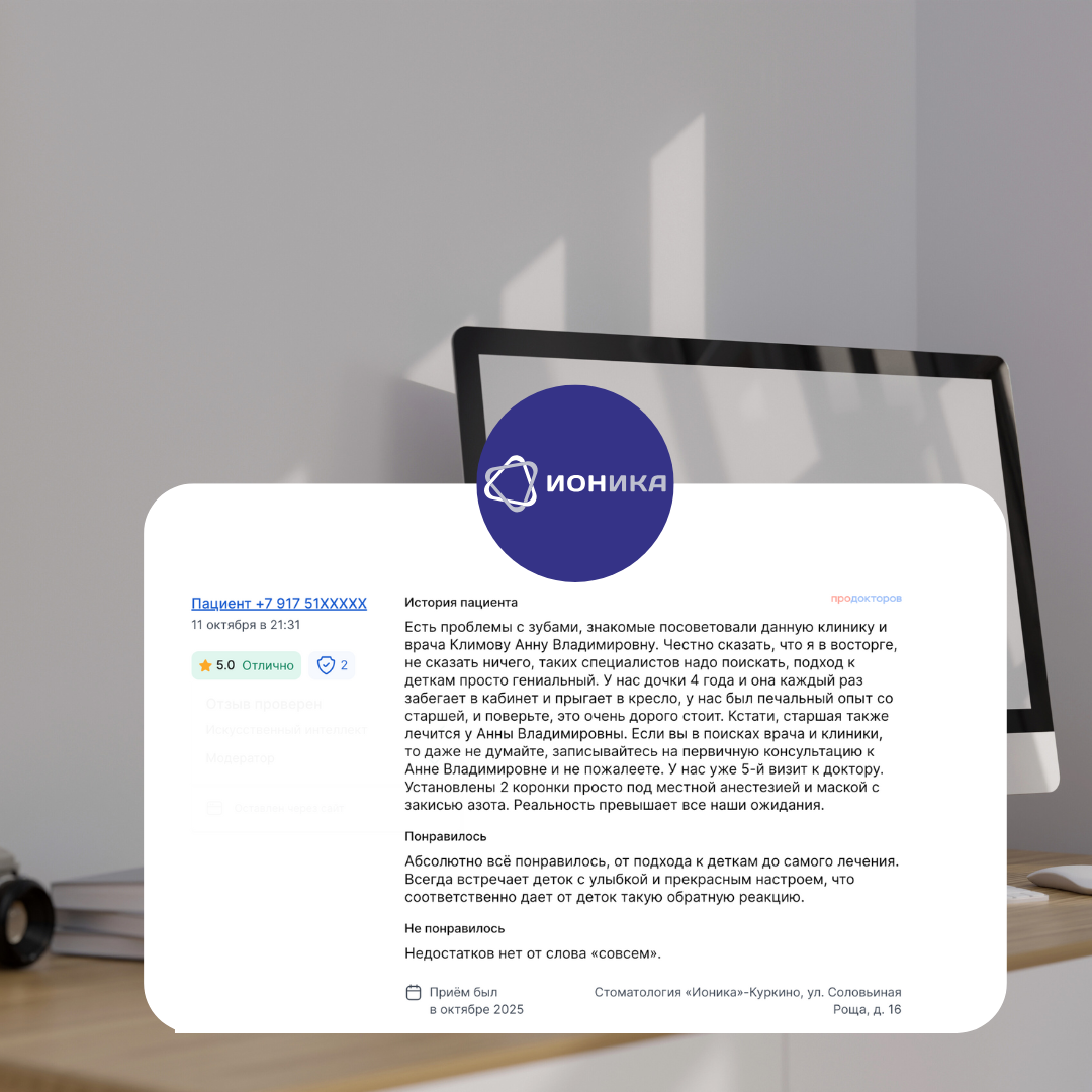 Здравствуйте. В Ионике наблюдаемся и лечимся всей семьей несколько лет. Врачи внимательные, ни разу не было нареканий, работают на 100%. Ресепшн работает идеально. Большая благодарность всему персоналу. Мое мнение, лучшая клиника в Куркино и не только.