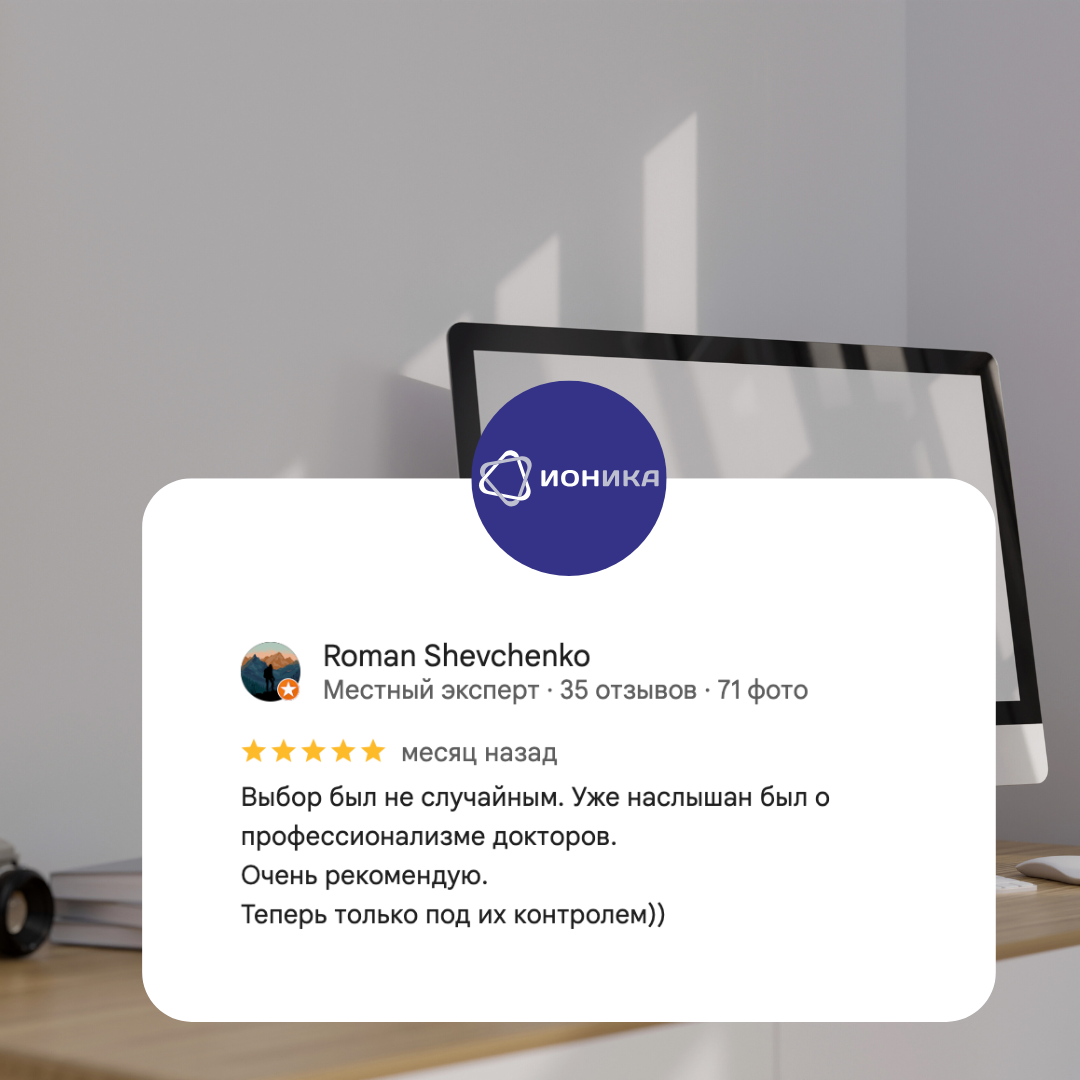 Я сложный пациент, за 50 лет накопилось. С "Ионикой" и её прекрасными врачами прошла длинный путь к здоровью и красивой улыбке... Терапевтическое лечение, протезирование, теперь гигиена. Особая благодарность Сипкину Александру Михайловичу (челюстно-лицевой хирург) - профессионал! В Ионике про любого врача можно так сказать. Лечение по протоколу и скидки, что безусловно приятно. С большим доверием и благодарностью ко всему коллективу клиники.