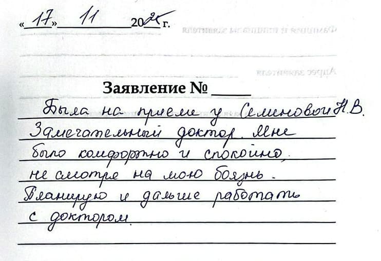 Спасибо большое Семеновой Н.В! Проконсультировала по всем вопросам и подробно объяснила план лечения! Вылечили кариес безболезненно
