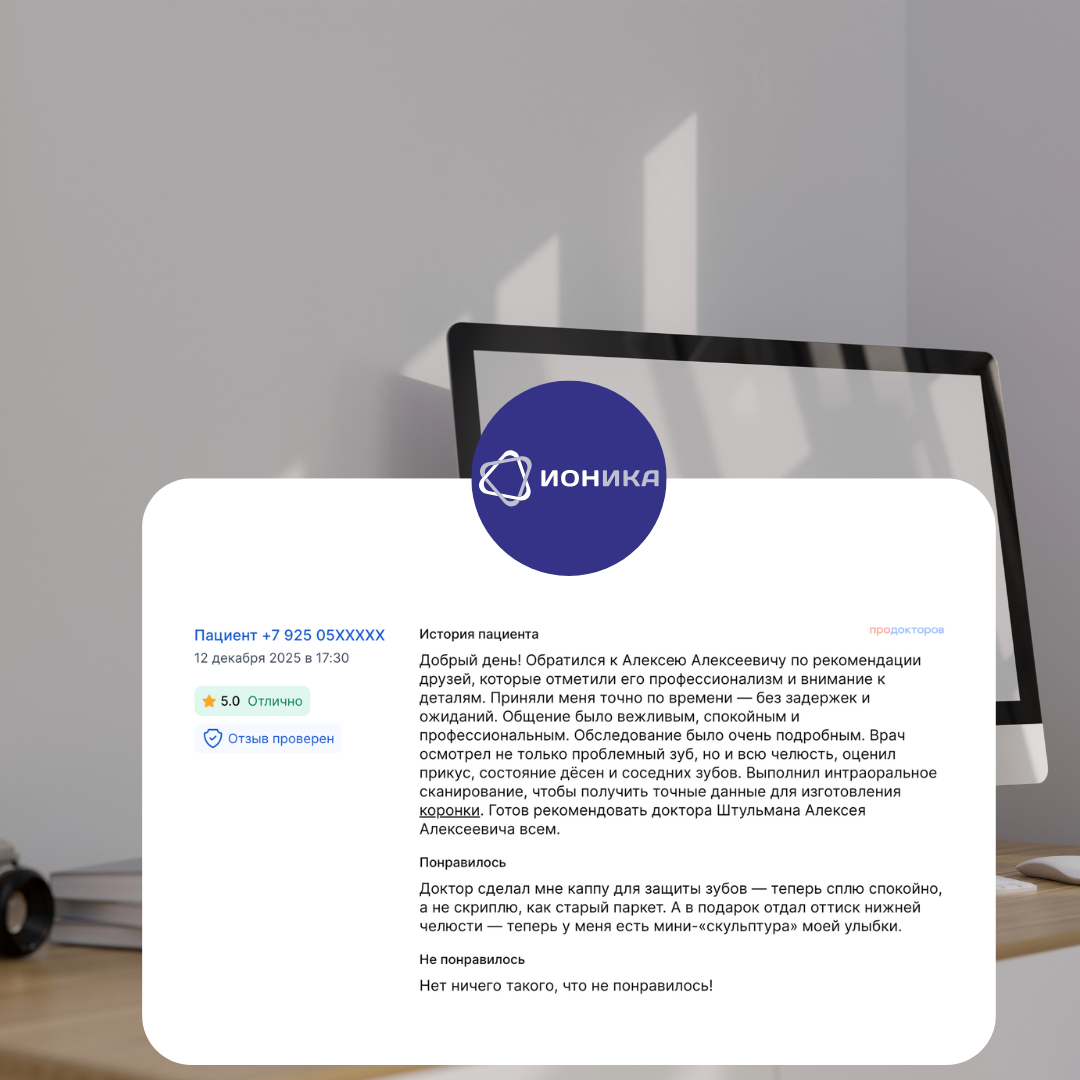 Добрый день! Обратился к Алексею Алексеевичу по рекомендации друзей, которые отметили его профессионализм и внимание к деталям. Приняли меня точно по времени — без задержек и ожиданий. Общение было вежливым, спокойным и профессиональным. Обследование было очень подробным. Врач осмотрел не только проблемный зуб, но и всю челюсть, оценил прикус, состояние дёсен и соседних зубов. Выполнил интраоральное сканирование, чтобы получить точные данные для изготовления коронки. Готов рекомендовать доктора Штульмана Алексея Алексеевича всем.