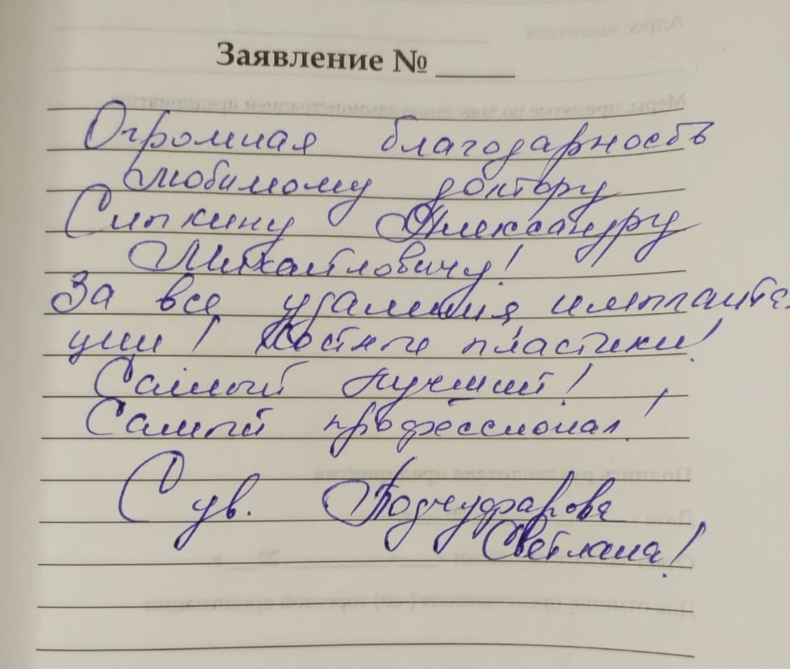 Огромная благодарность любимому доктору Сипкину Александру Михайловичу! За все удаления, имплантации! Костные пластики! Самый лучший! Самый профессионал!