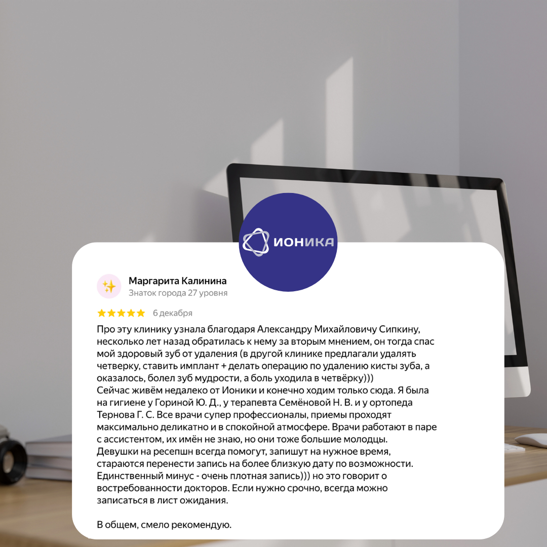 Недавно обратилась в клинику Ионика. Первое что очень понравилось - это бесплатный первичный прием, на котором сделали сканирование всех зубов тоже бесплатно. Далее решила ставить коронку на 6 зуб - результатом очень довольна. Зуб получился красивый, сделали быстро, качественно и цена очень приемлемая. В клинике очень причтная атмосфера, вежливый персонал и замечательные врачи. Отношение к клиенту 10 из 10. Будем ходить туда всей семьей. А еще чистка зубов очень понравилась — после нее не повысилась чувствительность , а все зубы словно новые стали.