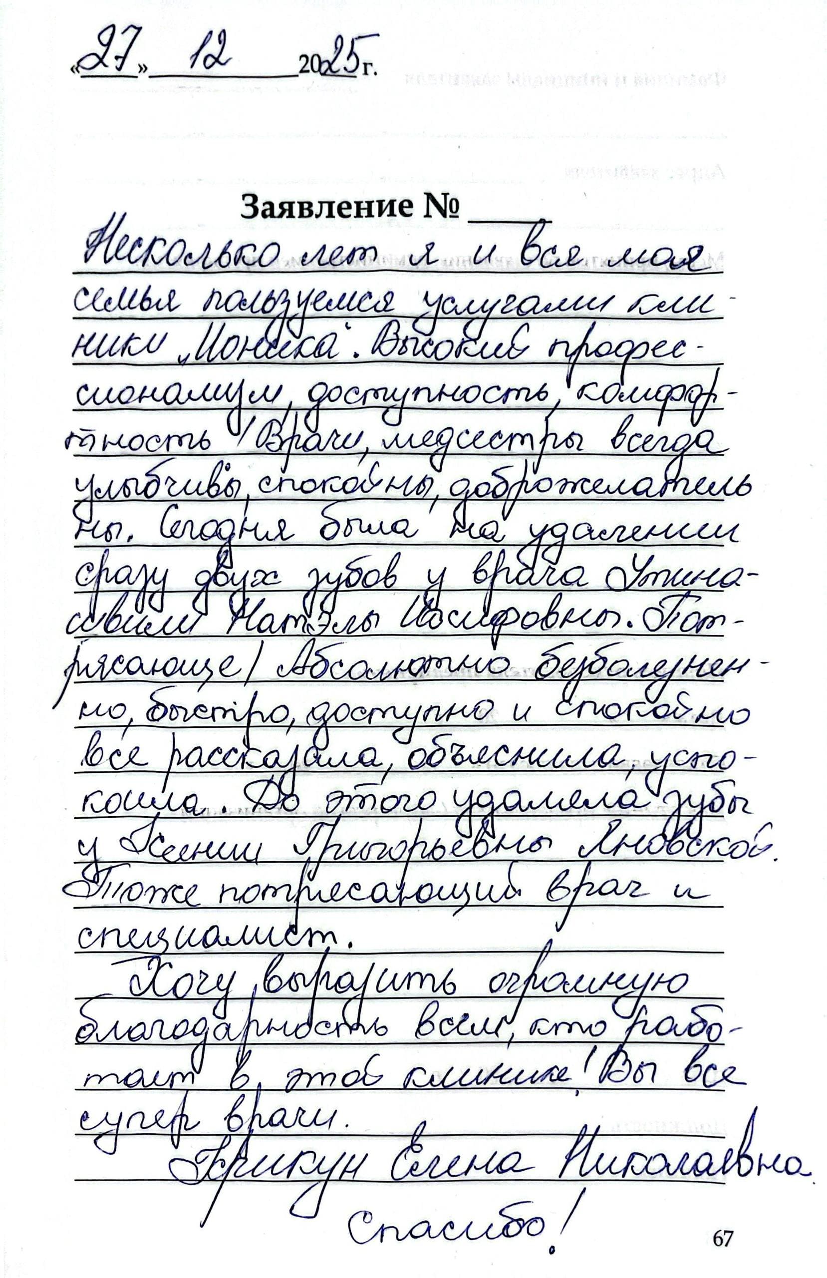 Хочу выразить большую благодарность за теплый прием каждый день. Все доктора замечательные, добрые, отзывчивые даже, если есть проблемы с открываем рта, есть решения на все!