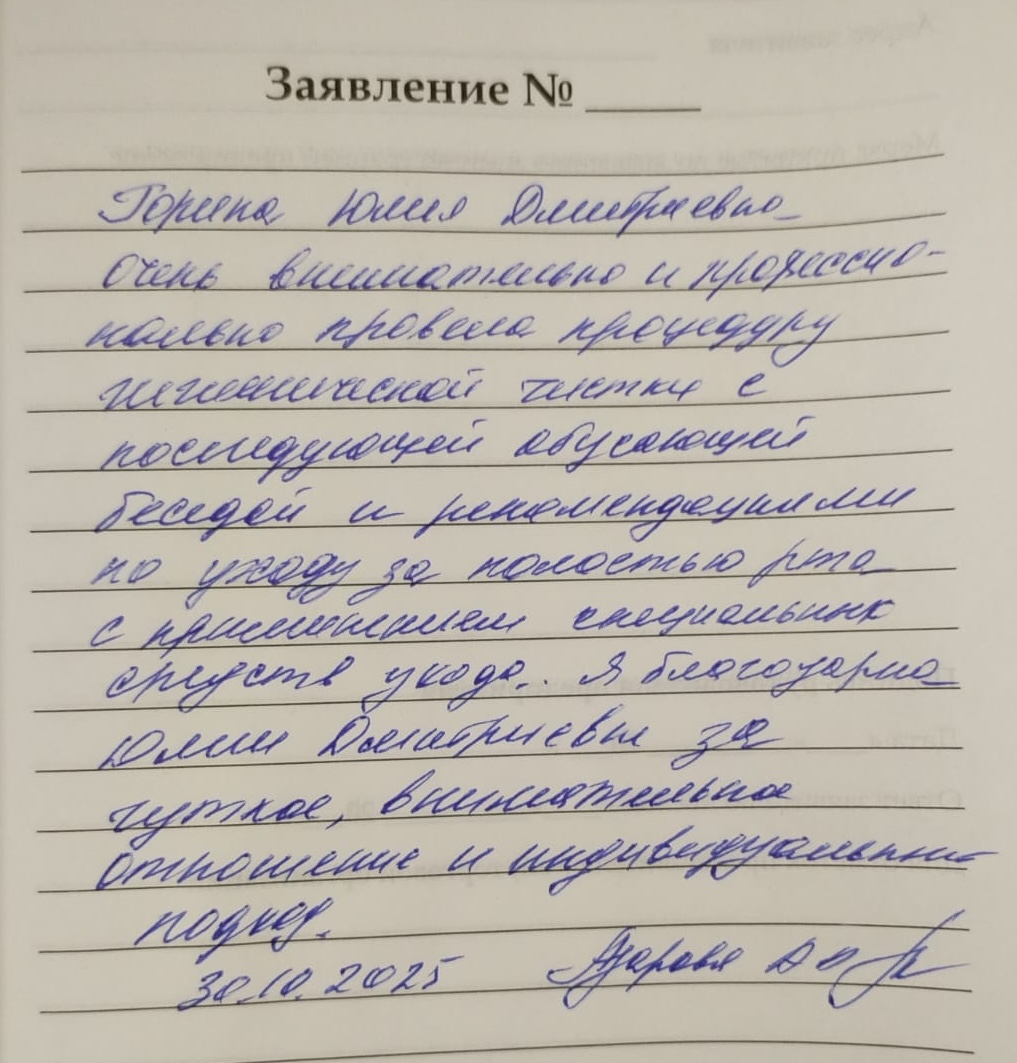 Горина Юлия Дмитриевна очень внимательно и профессионально провела процедуру гигиенической чистки с последующей обучающей беседой и рекомендациями по уходу за полостью рта с применением специальных средств ухода. Я благодарна Юлии Дмитриевне за чуткое, внимательное отношение и индивидуальный подход.