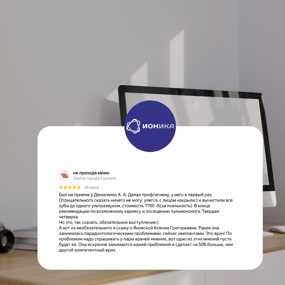 А вот из необязательного я скажу о Яновской Ксении Григорьевне. Ранее она занималась парадонтологическими проблемами, сейчас имплантами. Это врач! По проблемам надо спрашивать у пары врачей мнение, вот одно из этих мнений пусть будет ее. Она искренне занимается вашей проблемой и сделает на 50% больше, чем другой компетентный врач.