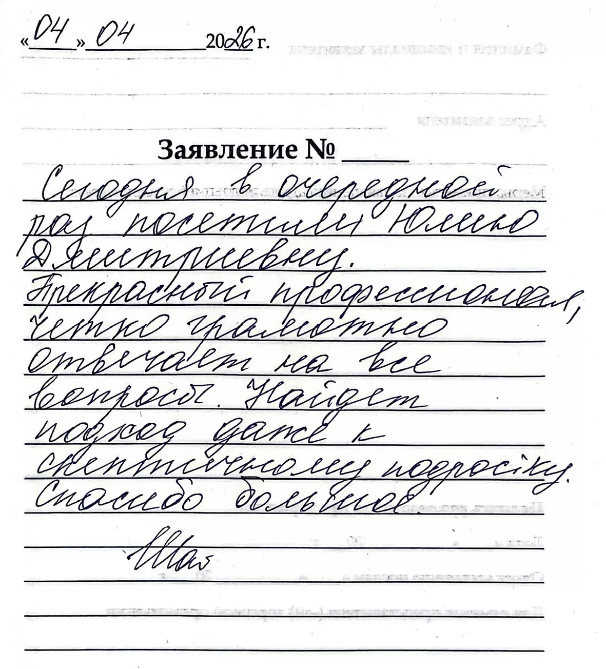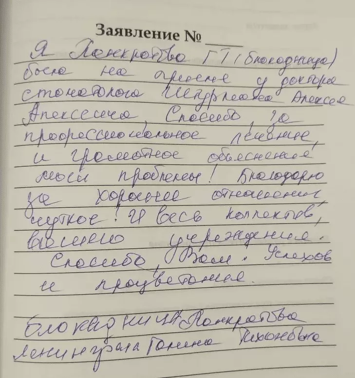 Я, Панкратова Г.Т. (Блокадница), была на приеме у доктора Штульмана Алексея Алексеевича. Спасибо за профессионализм, лечение и грамотное объяснение моей проблемы! Благодарю за хорошее отношение, чуткое! И весь коллектив вашего учреждения. Спасибо вам! Успехов и процветания!